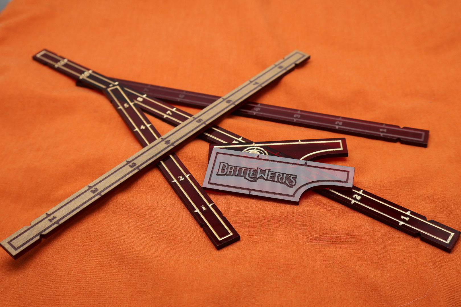 The Battle Kit comes with 6 high-quality acrylic measuring tools. The Battle Gauges are essential for making pile-in moves and checking weapon ranges while the Battle Sticks are great for measuring distances when models enter the game through deep strike, summoning, or reserves. Available in your choice of three transparent colors: red, blue, or black.